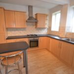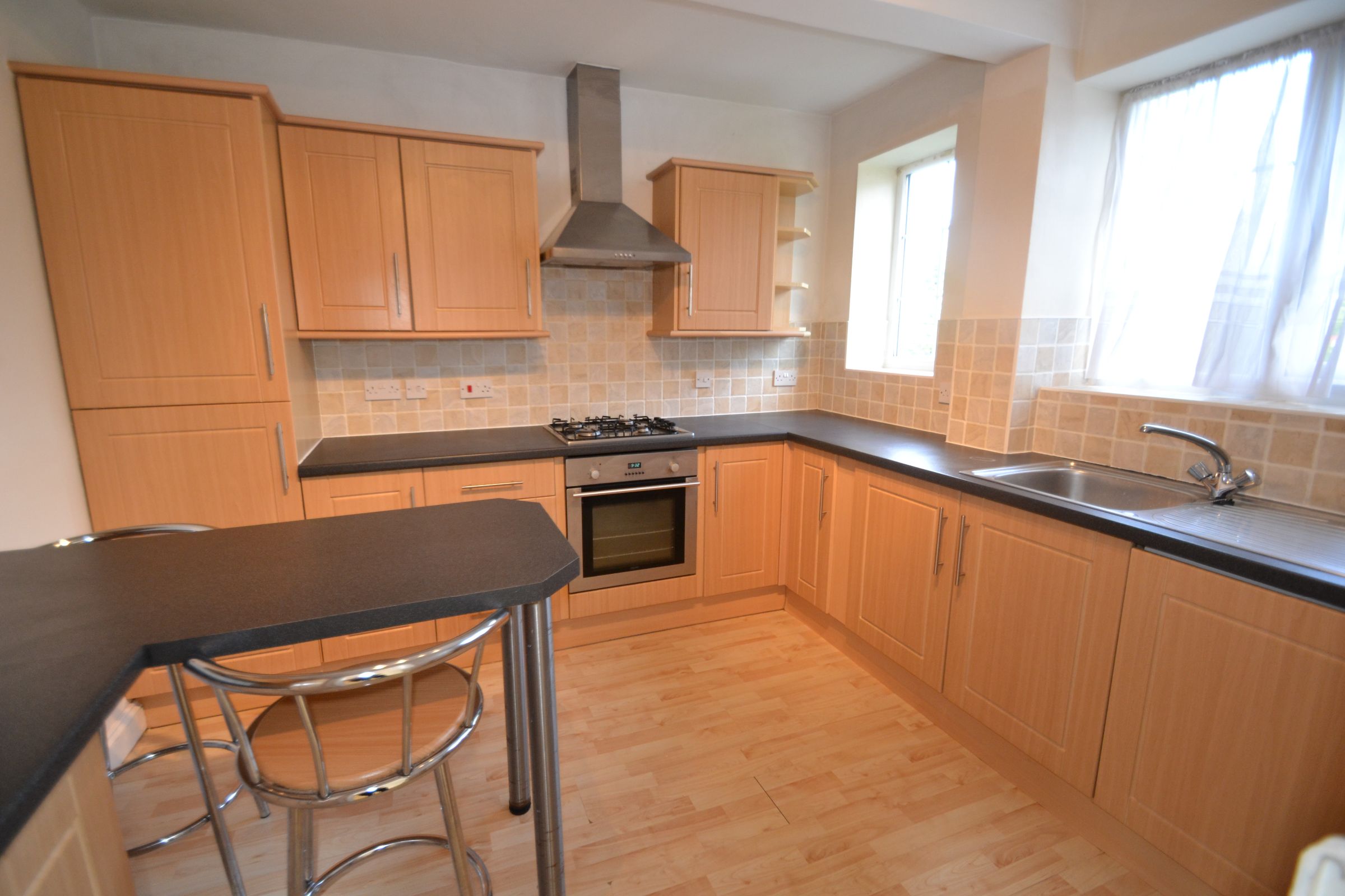 Fitted with a range of wooden wall and base units and including a built-in fridge/freezer, washing machine, electric oven and hob. Vinyl flooring and a window to the rear aspect.