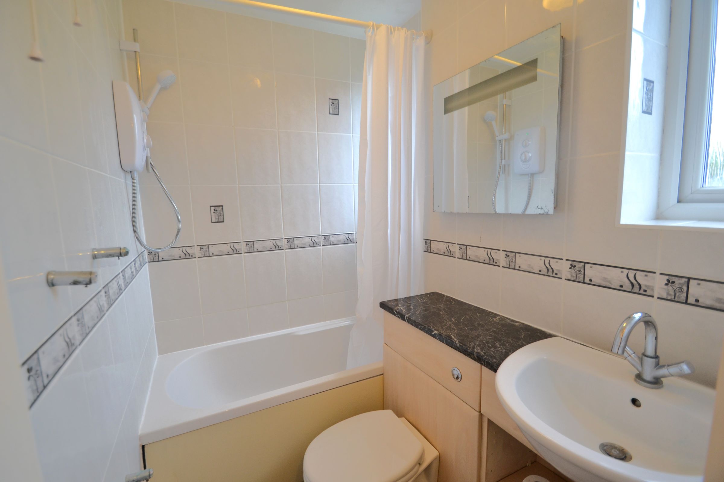 White three-piece suite comprising a panelled bath with shower over, WC and wash basin. Finished with vinyl flooring.