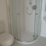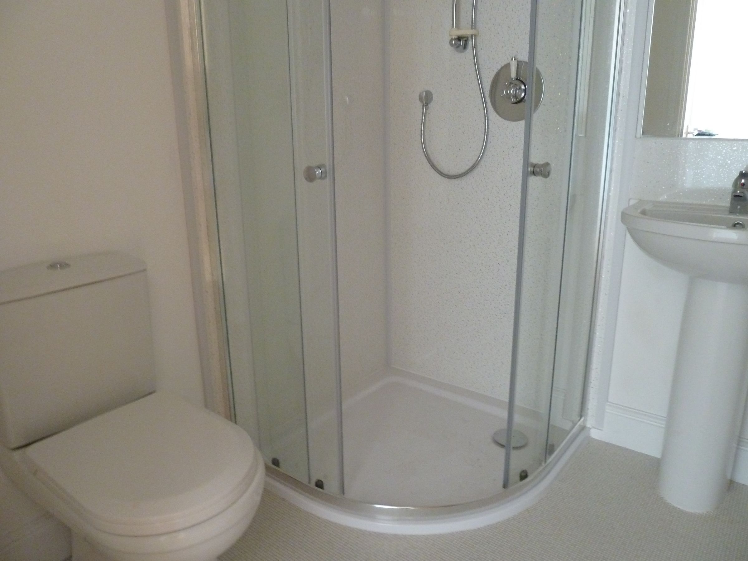 Corner shower cubicle, pedestal hand wash basin, low level WC, heated towel rail, extractor fan, fitted mirror, toilet roll holder, vinyl flooring, part tiled walls.