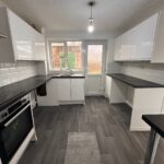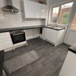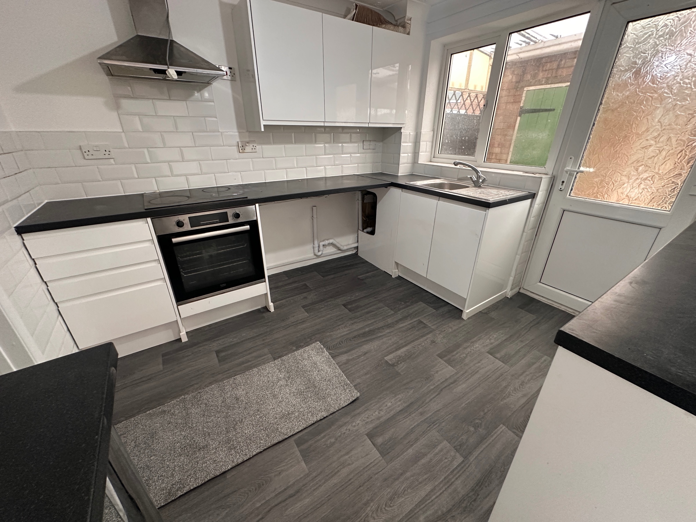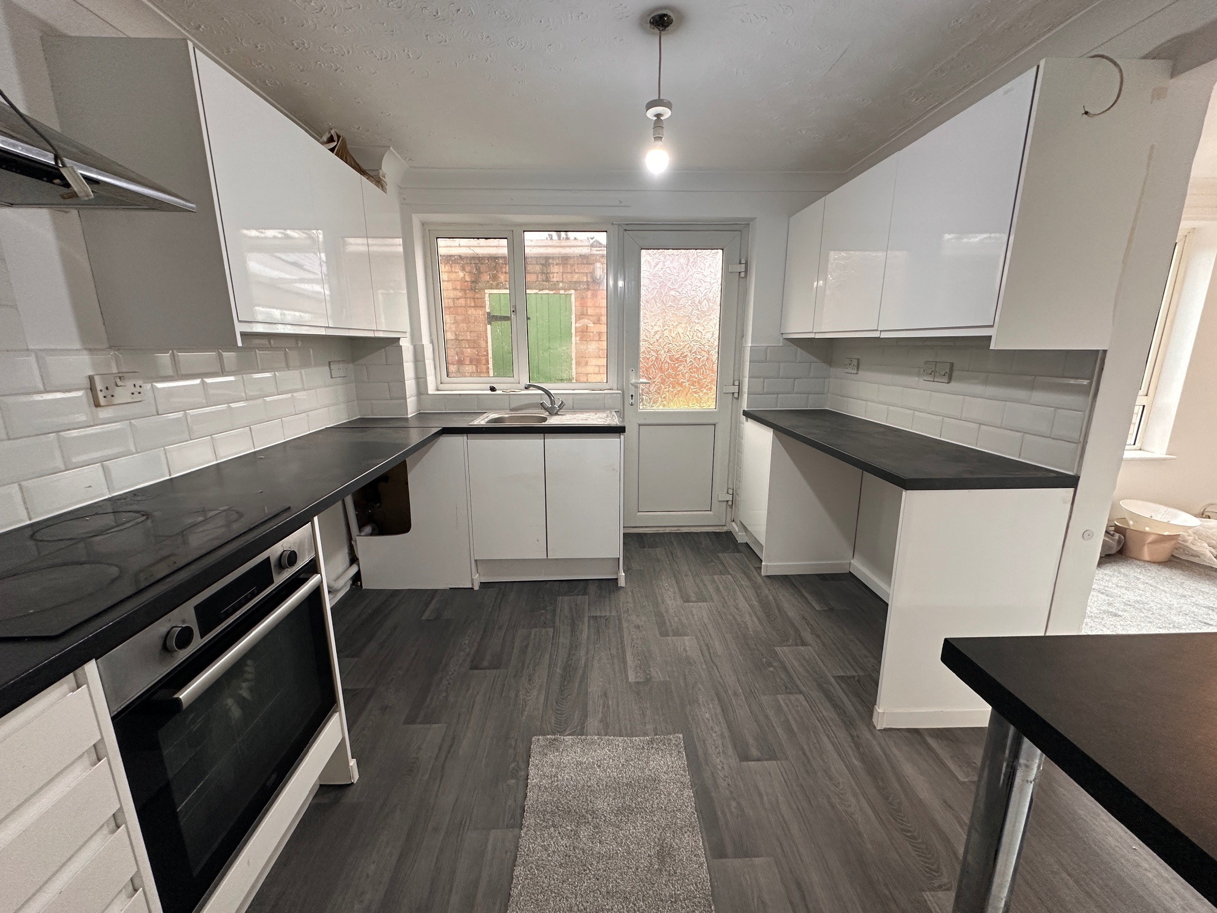 Range of white base and wall units with charcoal worktops and vinyl flooring. Window and door to the rear. Single drainer sink and built in electric oven and hob.