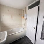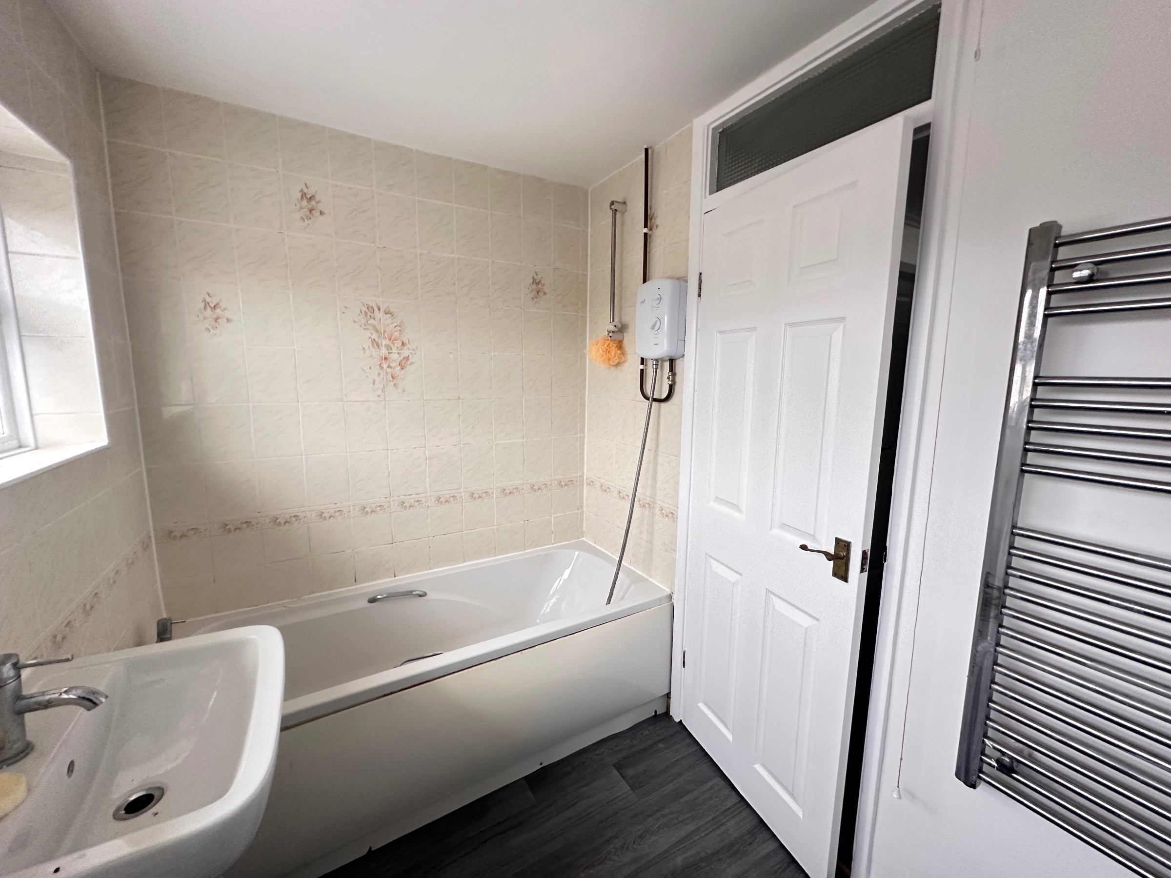 White suite comprising bath with electric shower over, low level WC, pedestal hand wash basin, vinyl flooring, heated towel rail and opaque window to the rear aspect.