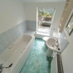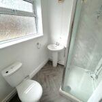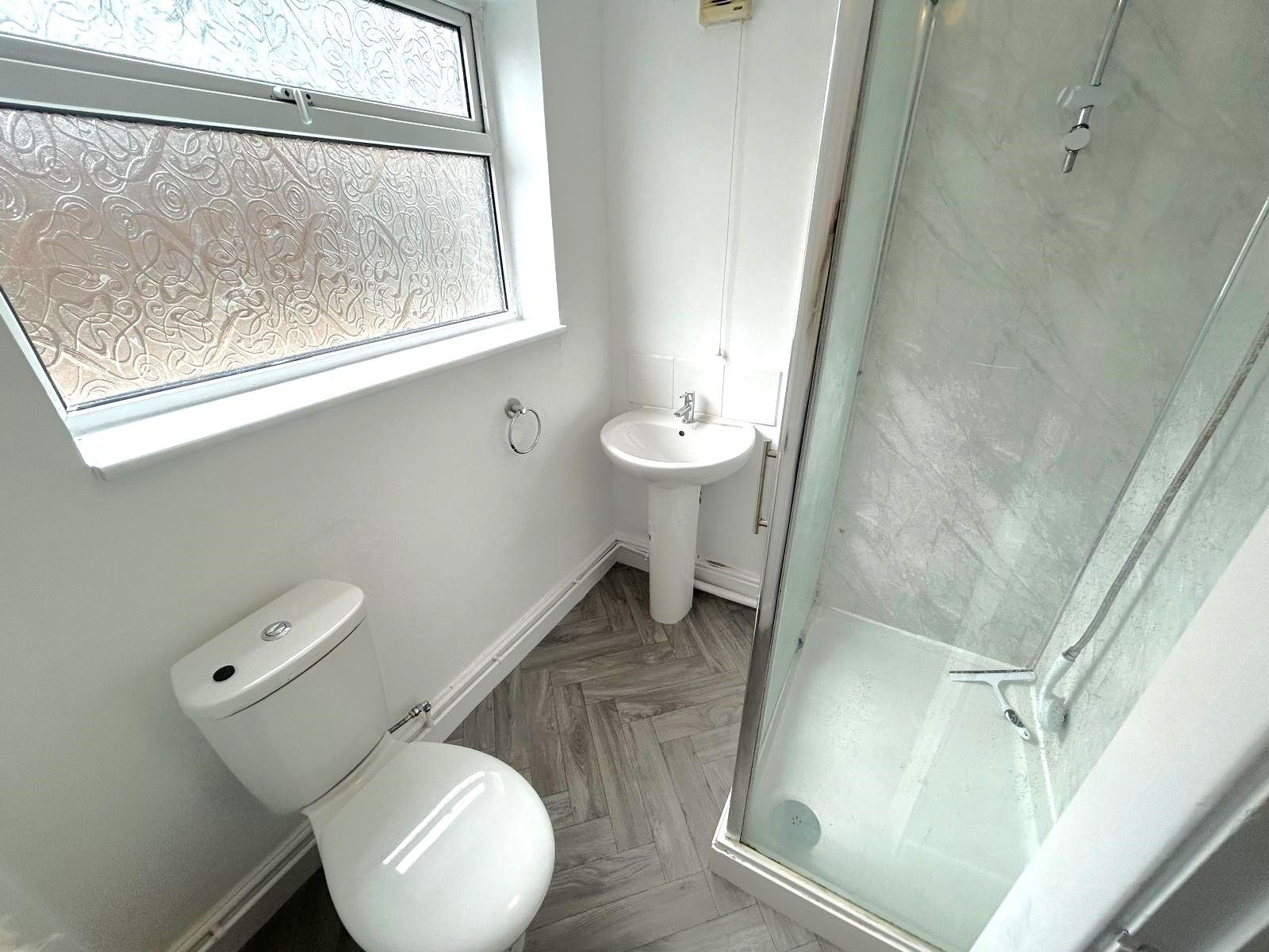 Ground floor shower room, white, newly fitted WC and basin, large shower enclosure, newly fitted vinyl flooring window to the rear.