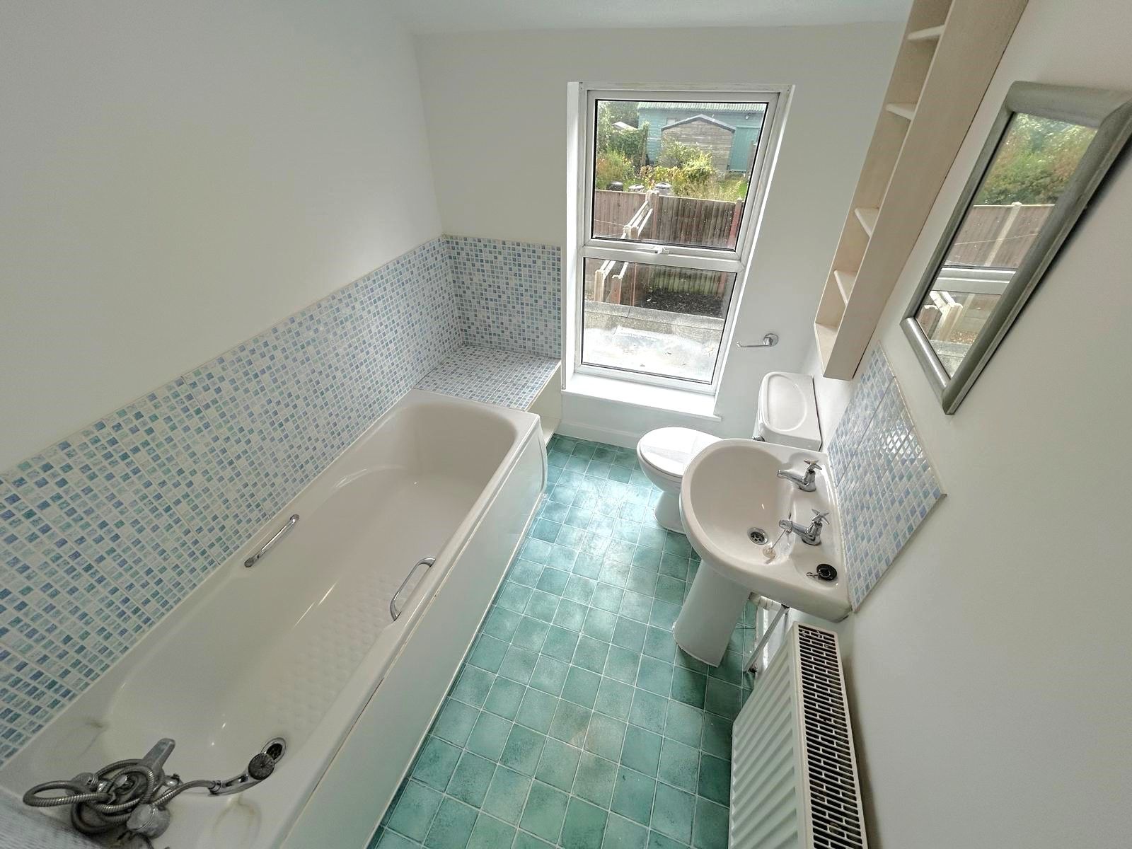 En-suite bathroom, with a white three-piece suite and a window to the rear, radiator