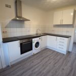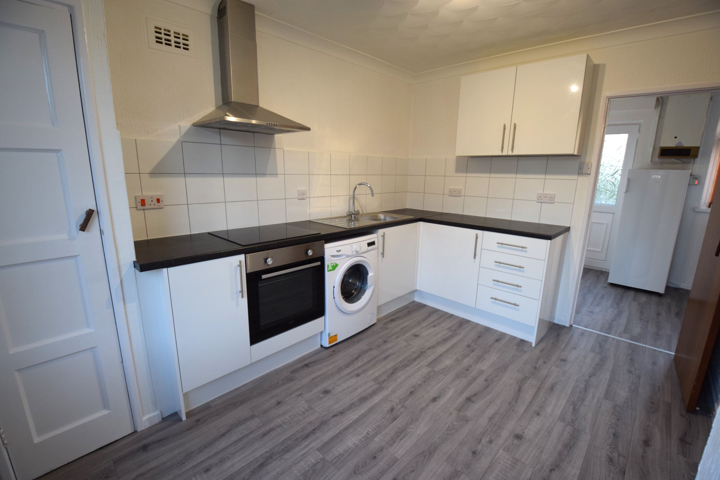 Modern fitted kitchen offering a range of white wall and base units with a built-in electric oven and hob and washing machine. Window to the front aspect. Finished with vinyl flooring, tiled splashback, and neutral décor. Radiator included. Door leading through to the utility area.