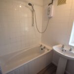 Fitted with a panelled bath and shower over, plus hand basin. Finished with tiled walls and vinyl flooring.