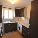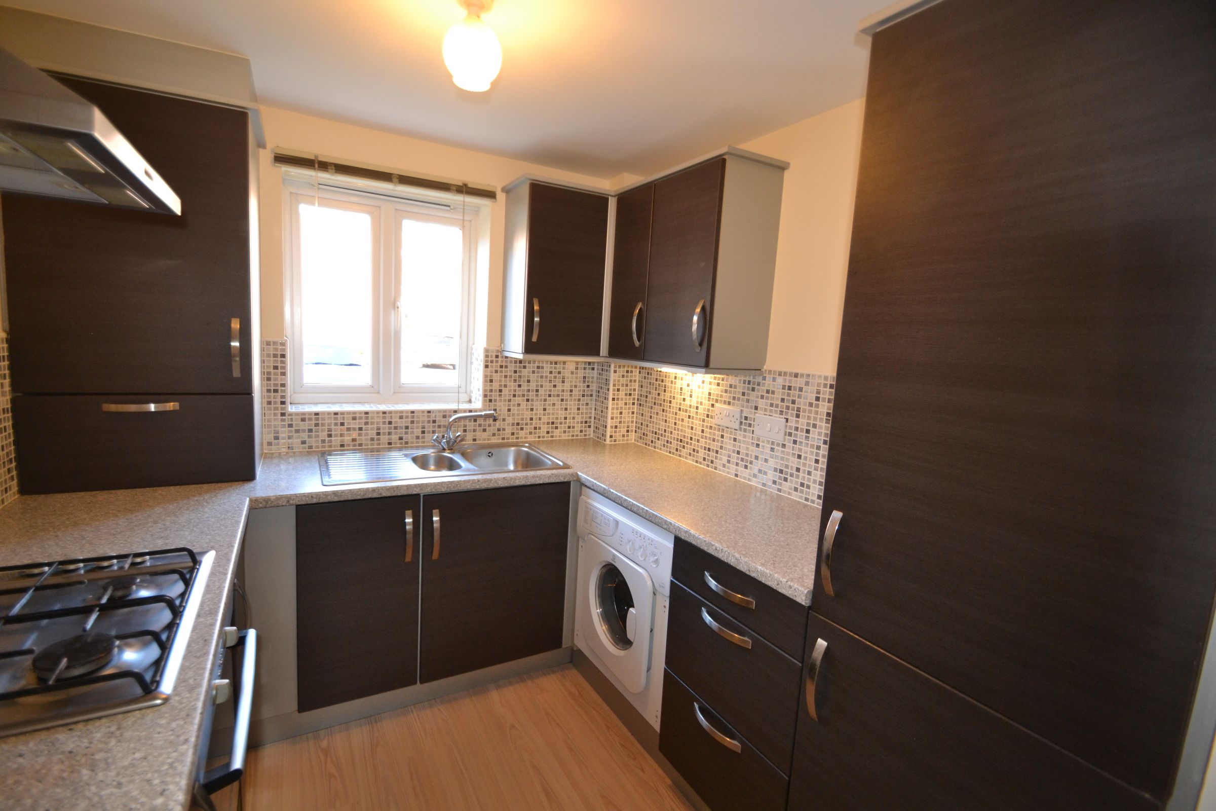 The contemporary kitchen is fitted with dark wood-effect wall and base units, contrasting worktops, and mosaic-style tiled splashbacks. Appliances include an integrated oven, gas hob with extractor fan, fridge freezer, and washing machine.