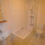 Finished with a three-piece suite comprising a panelled bath with shower over, WC, and hand basin. Includes tiled splashbacks and white tiled flooring.