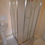 A generous double bedroom with wood-effect flooring, neutral decor and a built-in double wardrobe. Benefits from a private en-suite shower room featuring a walk-in shower cubicle, WC, and wash basin.