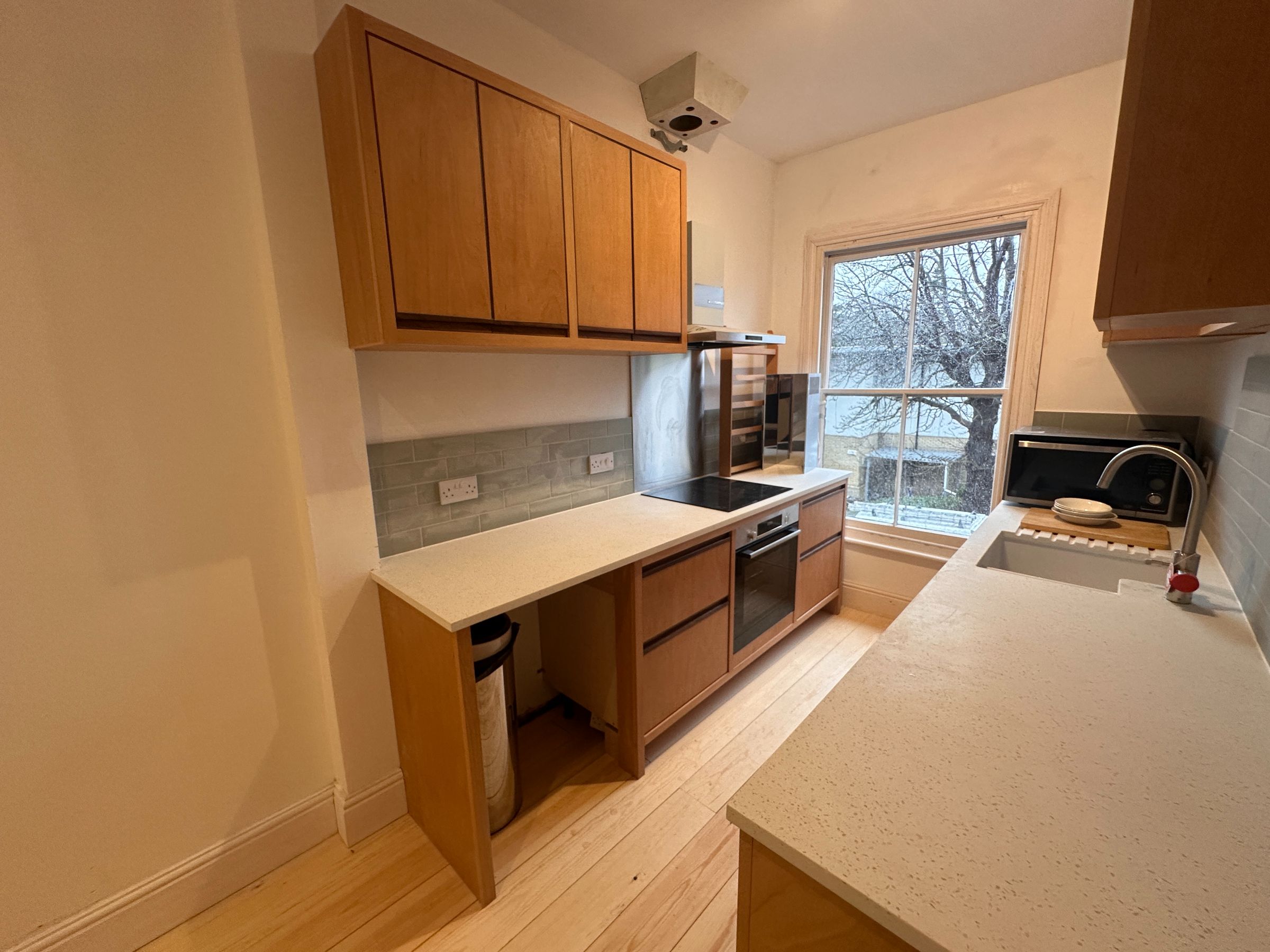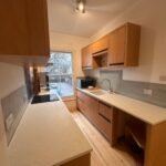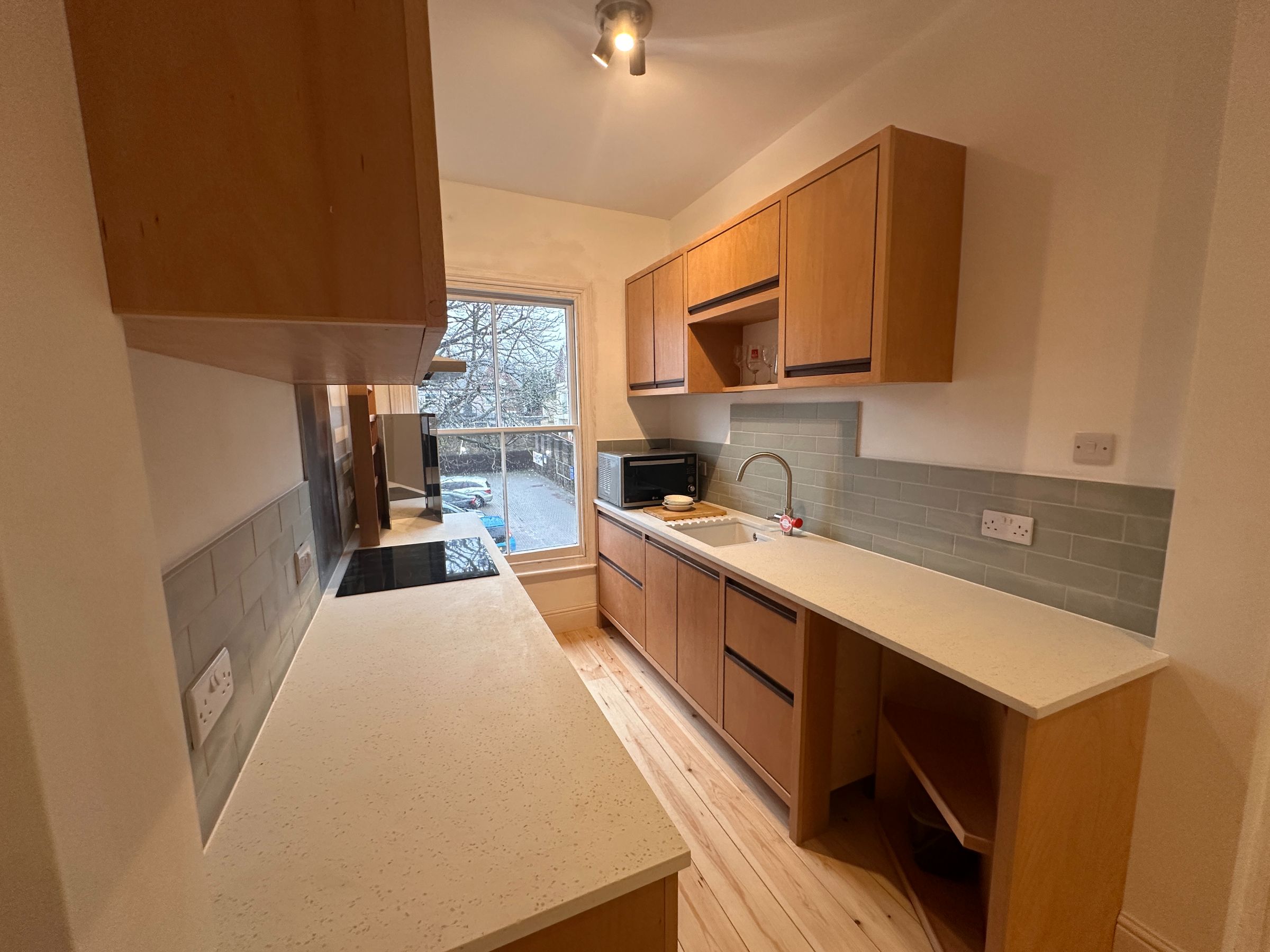 Newly fitted kitchen with range of wall and base units, built in electric oven and hob, with space for appliances