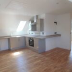 Modern kitchen with a range of grey gloss base and wall units, work surfaces with inset 1 ½ bowl sink unit, fitted oven, hob and extractor and breakfast bar. Space and plumbing for a washing machine and space for a small fridge freezer. The living area has a window to the front and a skylight to the rear, electric heater, oak effect flooring and an airing cupboard.