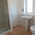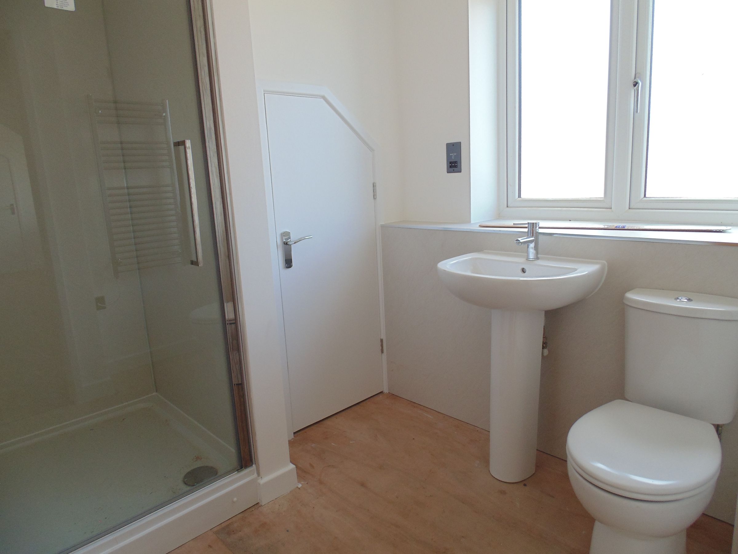 Large shower cubicle, pedestal hand wash basin and low-level WC. Heated towel rail, storage cupboard, vinyl flooring and opaque window.