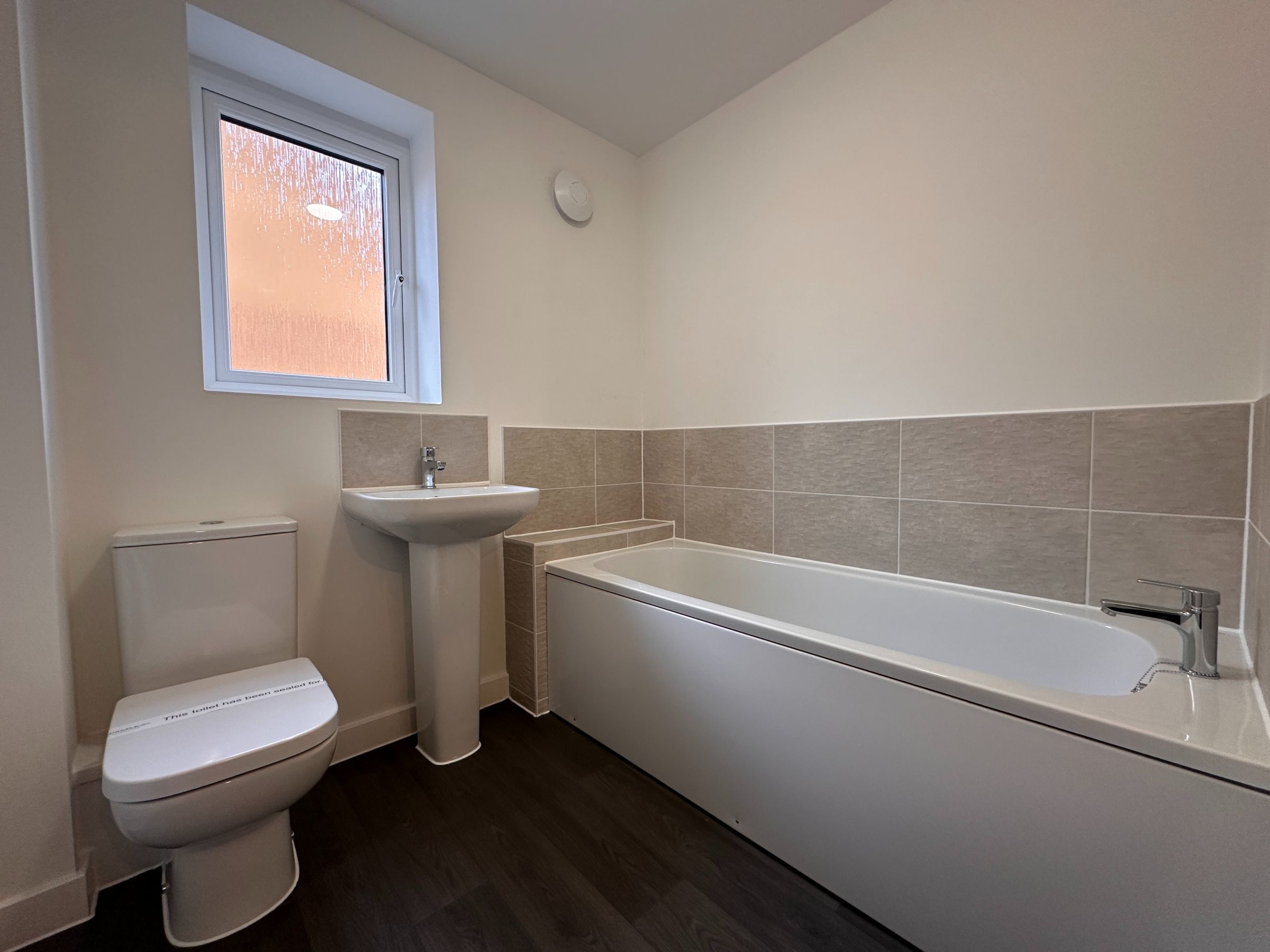 Fitted with a modern suite comprising a bath, WC and wash basin. Finished with contemporary square tiling and vinyl flooring.