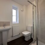 Fitted with a single walk-in shower cubicle, WC and wash hand basin. Finished with beige square tiling surrounding the shower area and above the wash basin, complemented by brown wood-effect flooring.